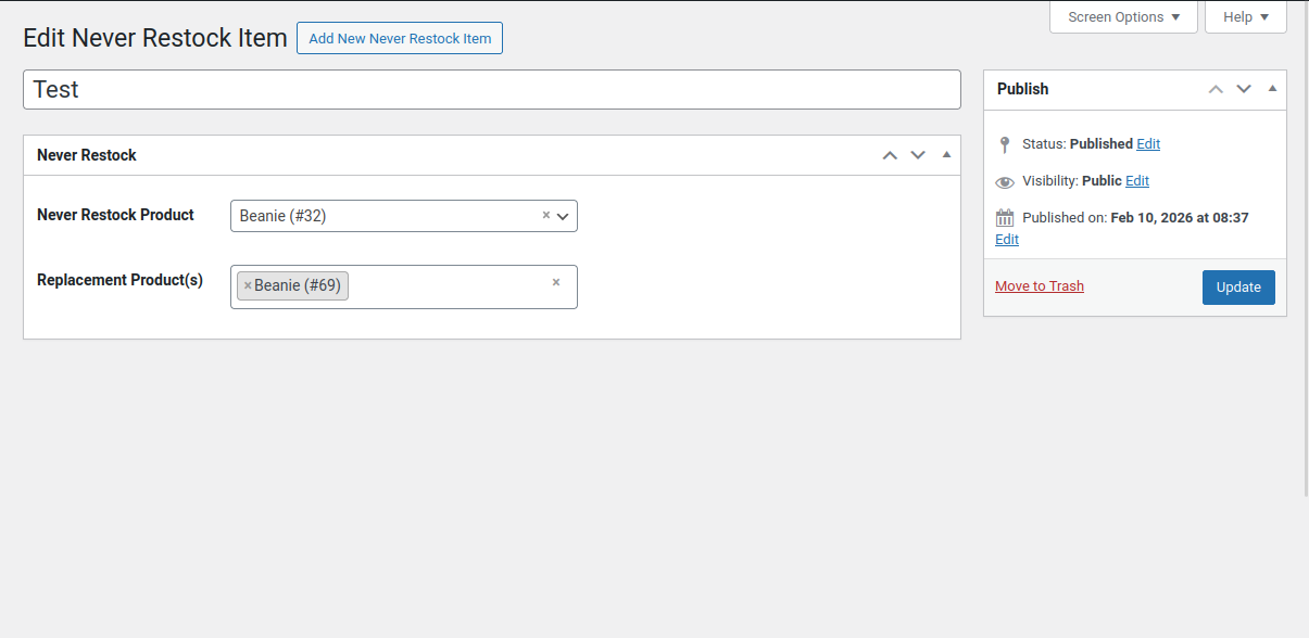 Replacement products configured in Never Restock rules