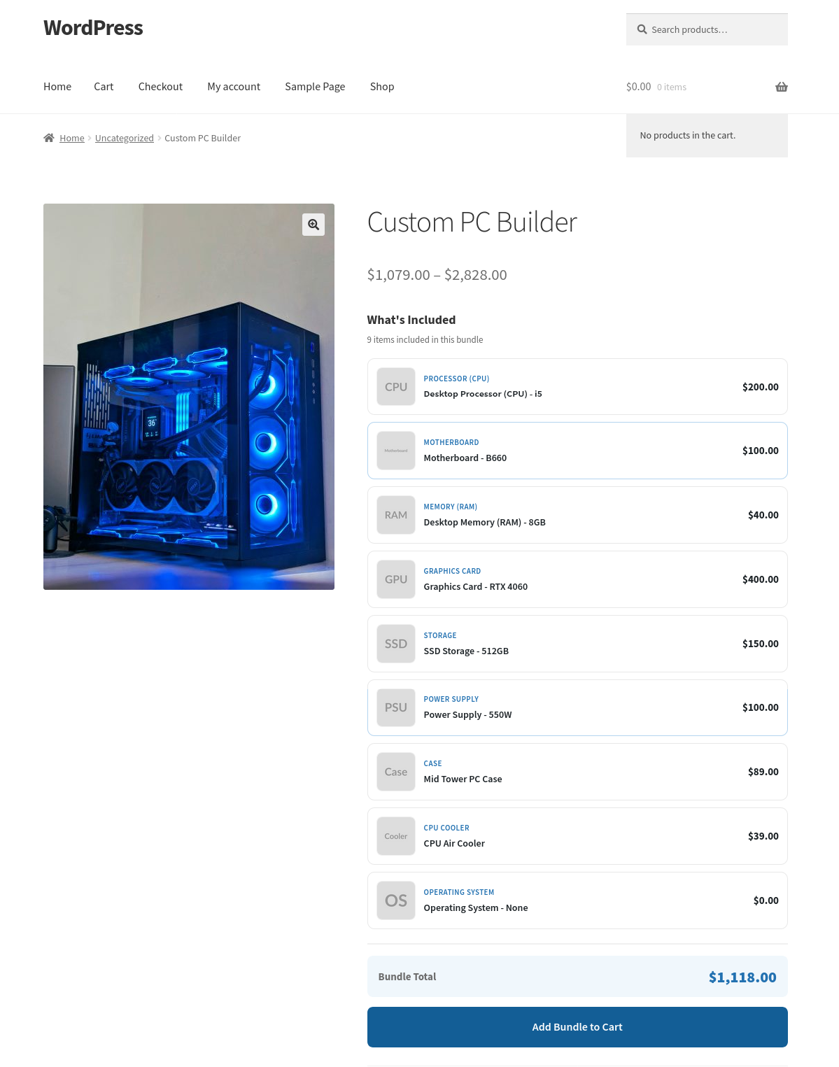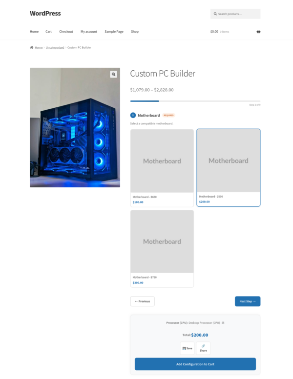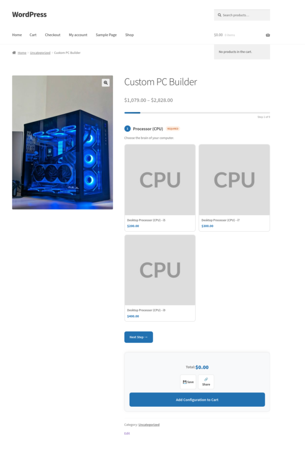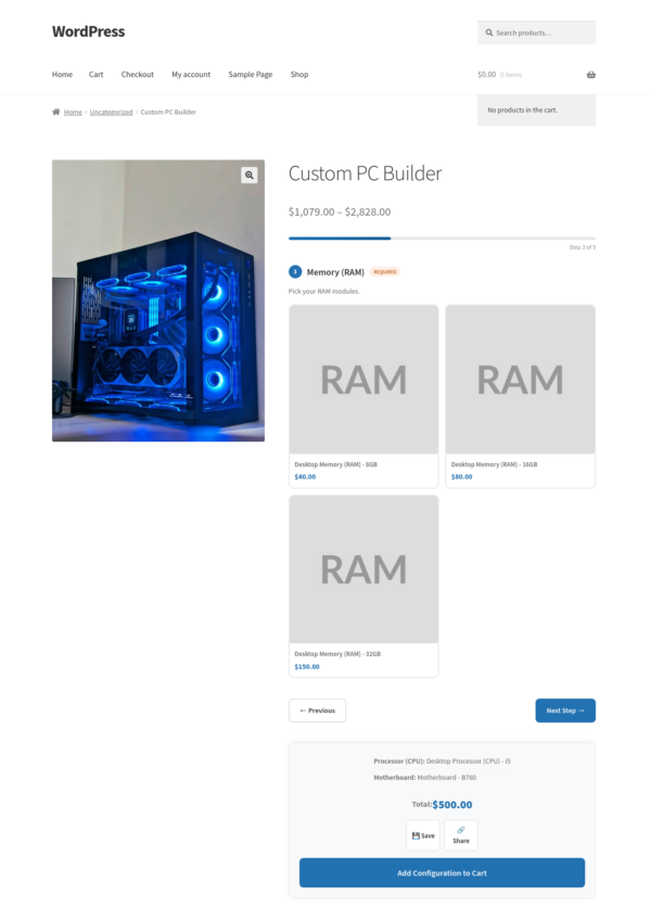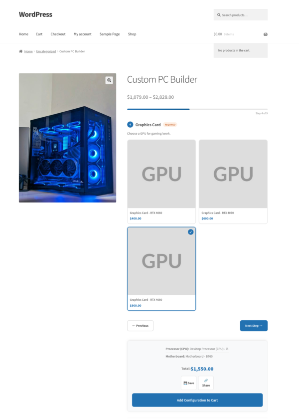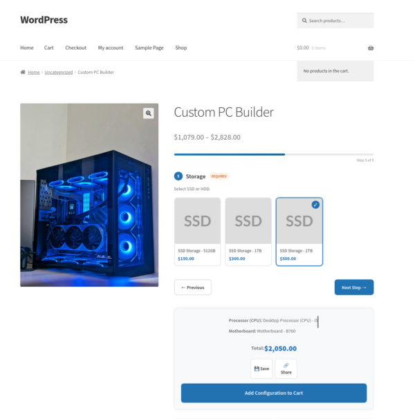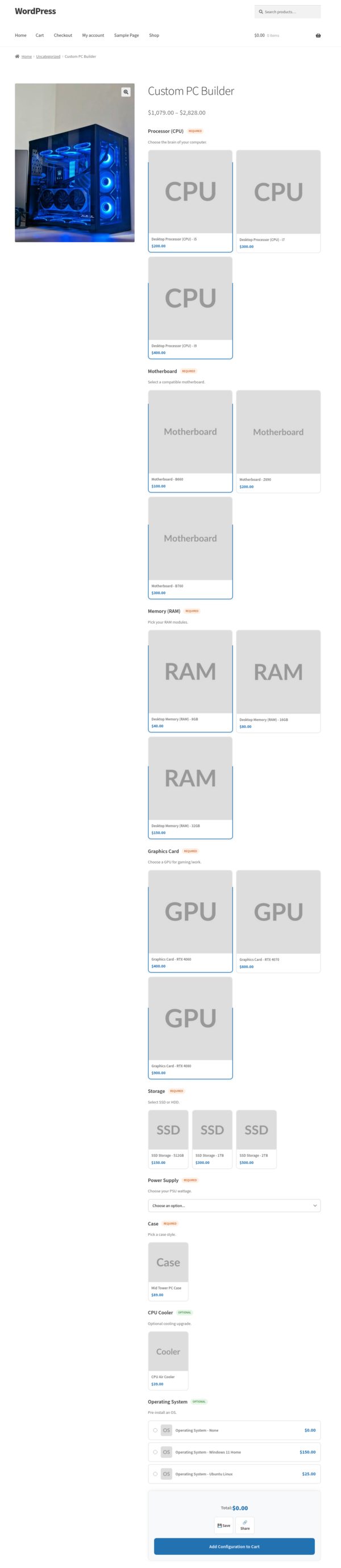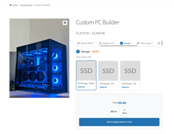 Another example: a computer builder. You create components for the processor, RAM, storage, and case. You add the relevant products to each component. The customer configures their machine, sees the total update live as they make selections, and adds it to the cart in one click.