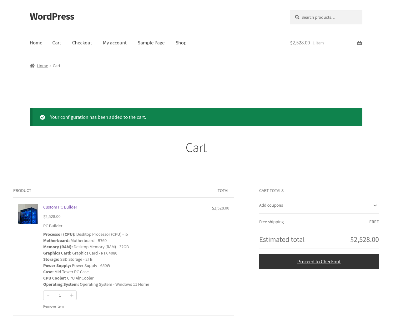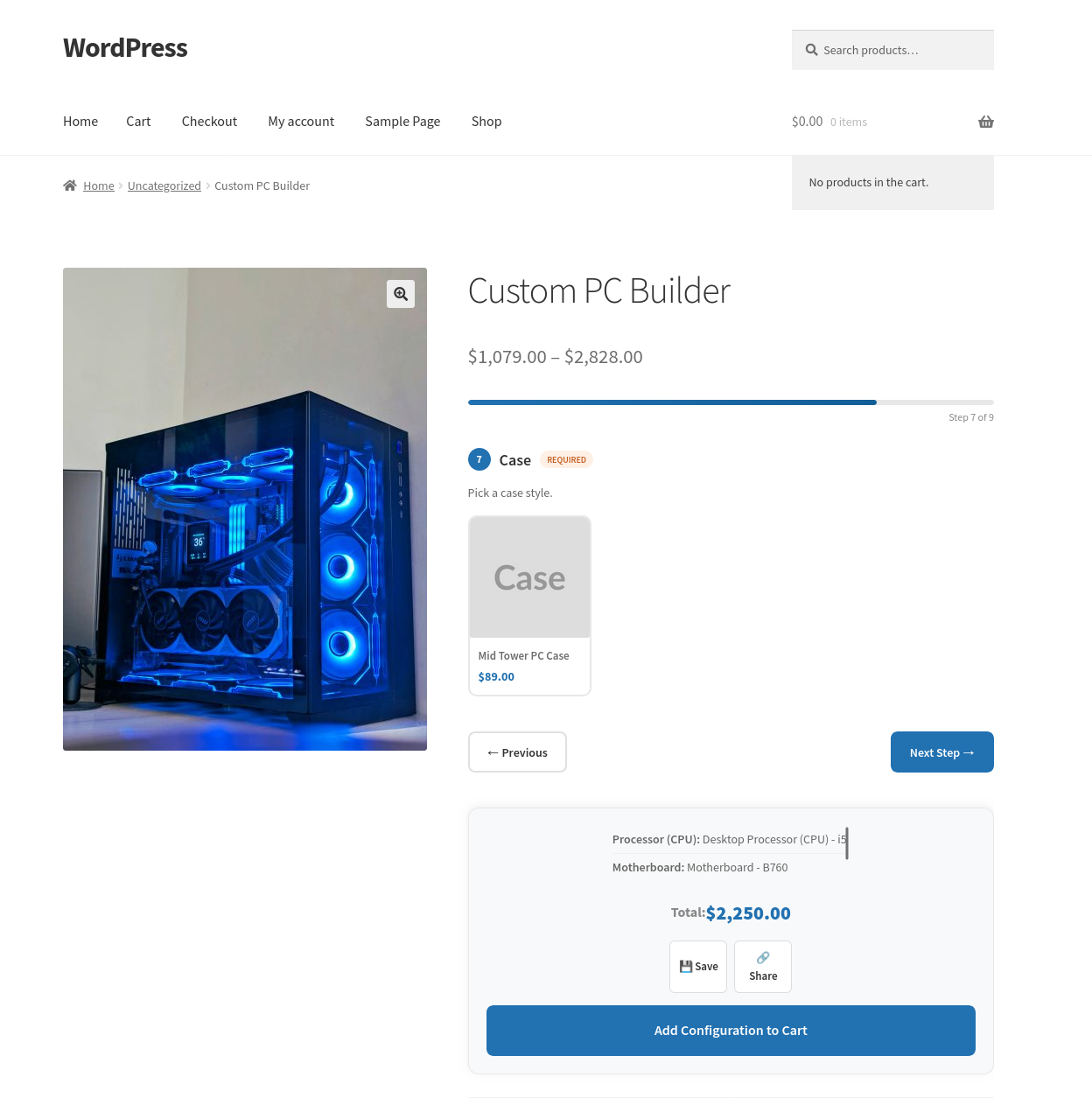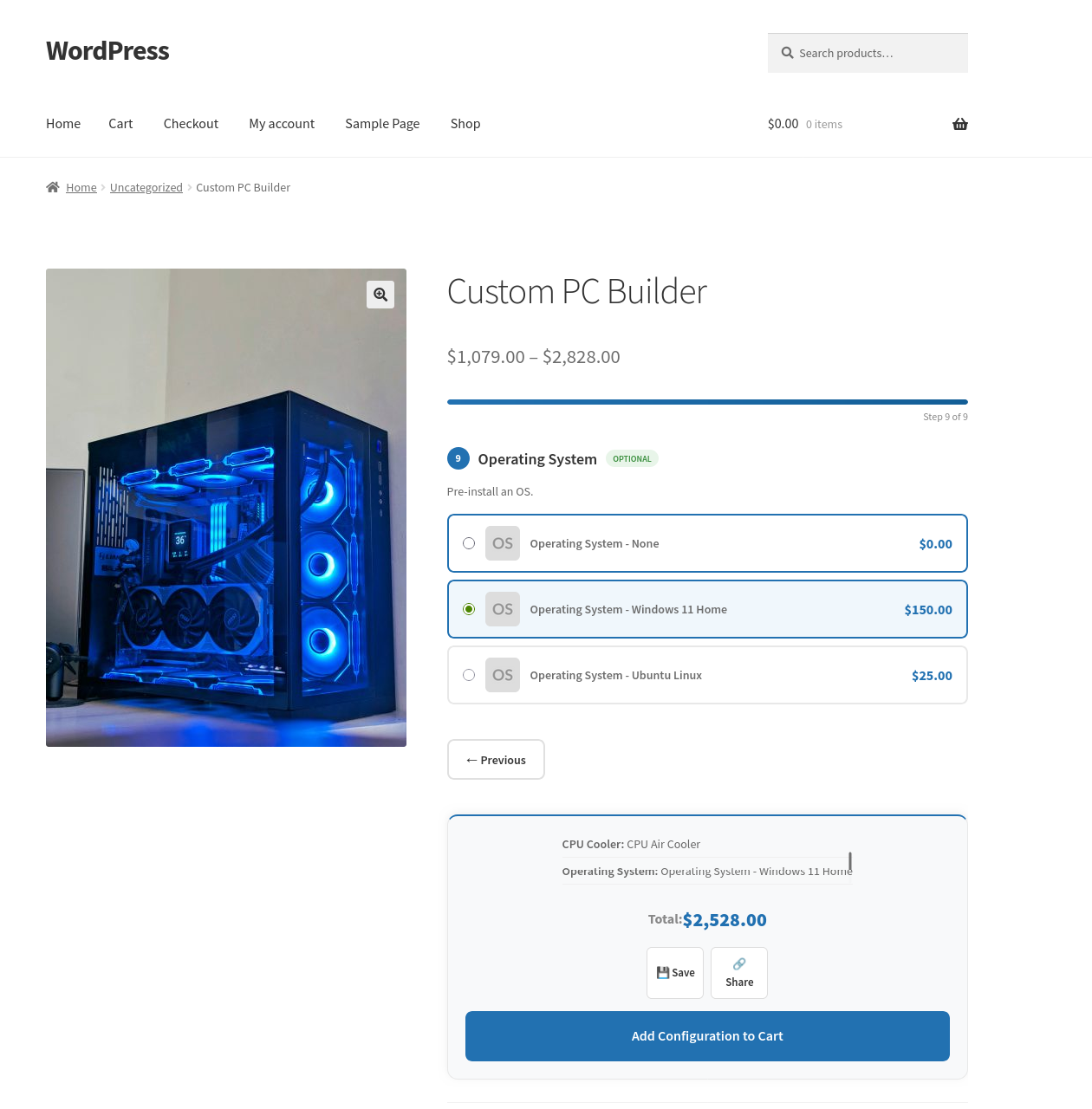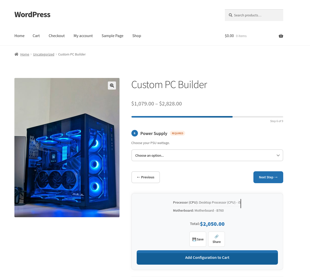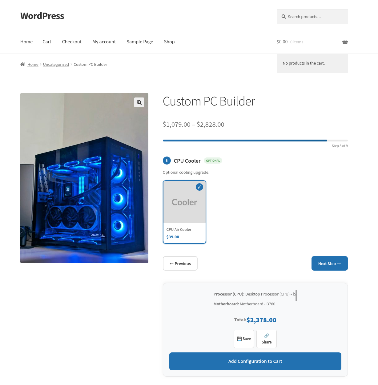 Another example: a computer builder. You create components for the processor, RAM, storage, and case. You add the relevant products to each component. The customer configures their machine, sees the total update live as they make selections, and adds it to the cart in one click.