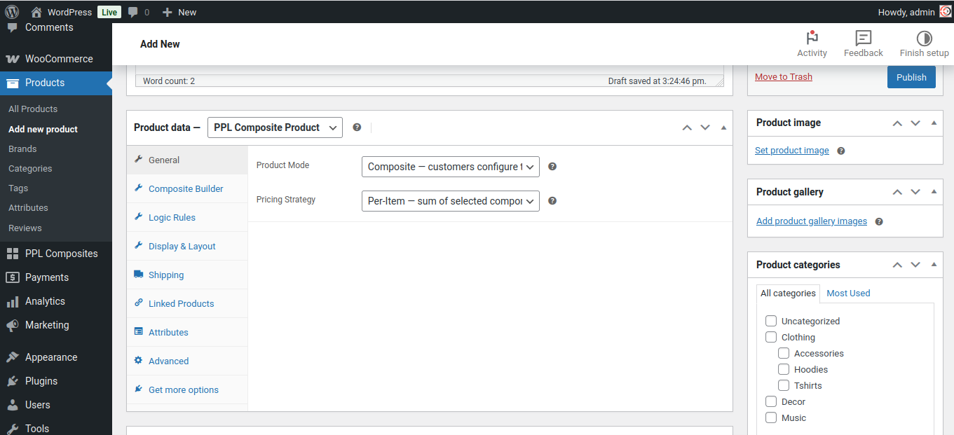 When you edit a product and set its type to Composite, a Builder tab appears. You add components, give each one a name and description, set whether it is required or optional, and search for the products that belong to it. You can set a minimum and maximum quantity per component, and apply a discount to all products in a component.