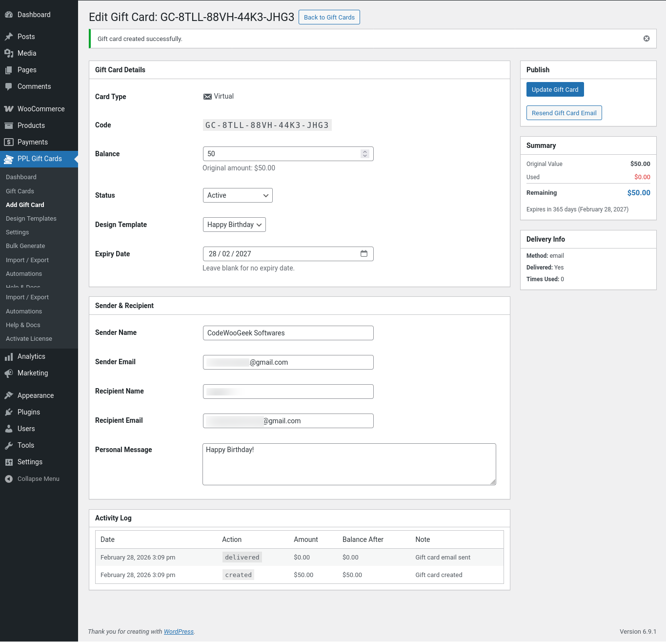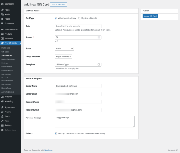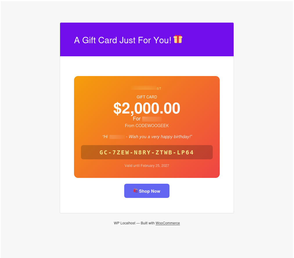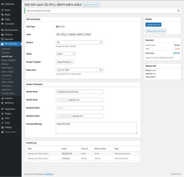Gift Cards for WooCommerce is a full-featured gift card plugin that lets you sell, manage, and deliver gift cards directly from your WooCommerce store. Whether you want to boost sales during the holiday season, reward loyal customers, or offer store credit – this plugin handles everything in one place, with no add-ons or upsells required.