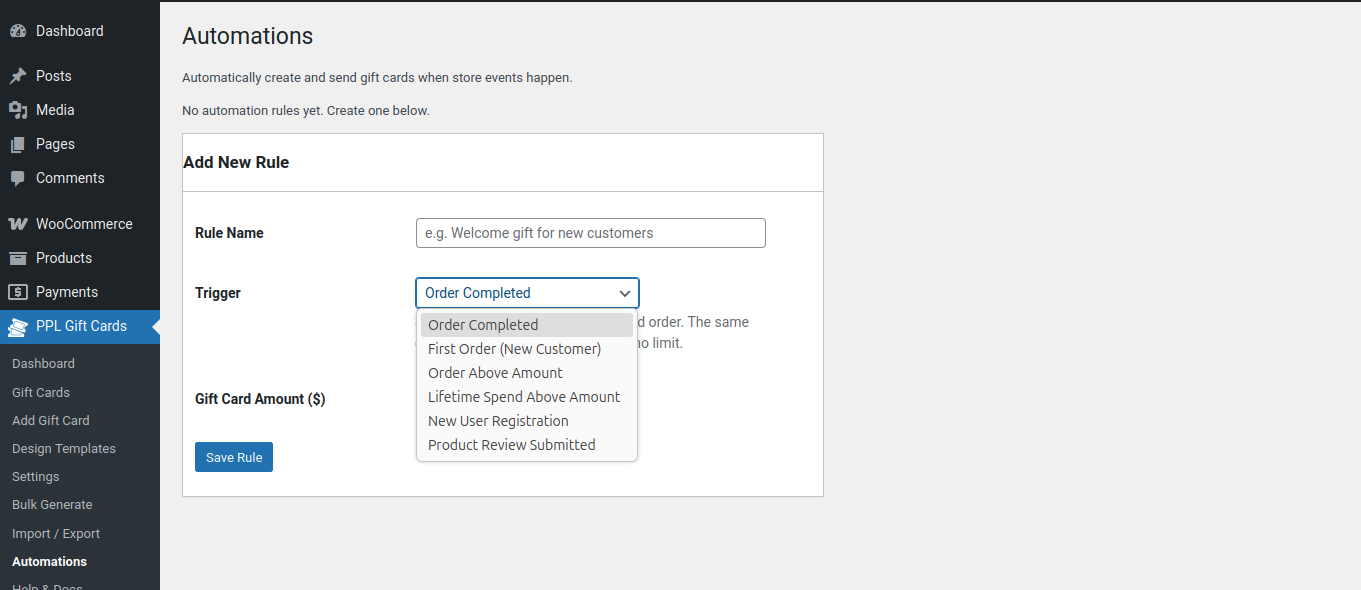 With the built-in Automation Rules engine, you can automatically issue gift cards when a customer completes a purchase or creates a new account. Set the trigger, set the card value, and the plugin takes care of the rest – no manual work required.