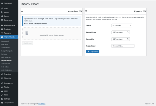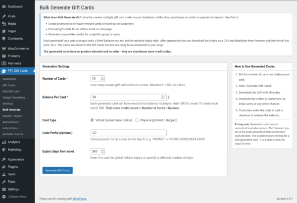 Need to issue cards in bulk for a campaign or corporate order? The Bulk Generate tool lets you create up to 1,000 gift cards in one click. You can also import cards from a CSV file and export your entire gift card list at any time.