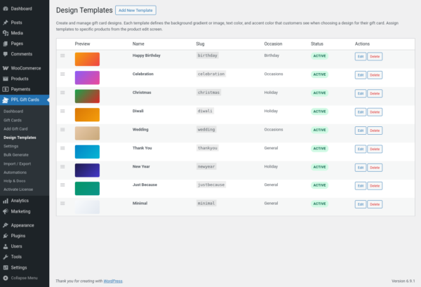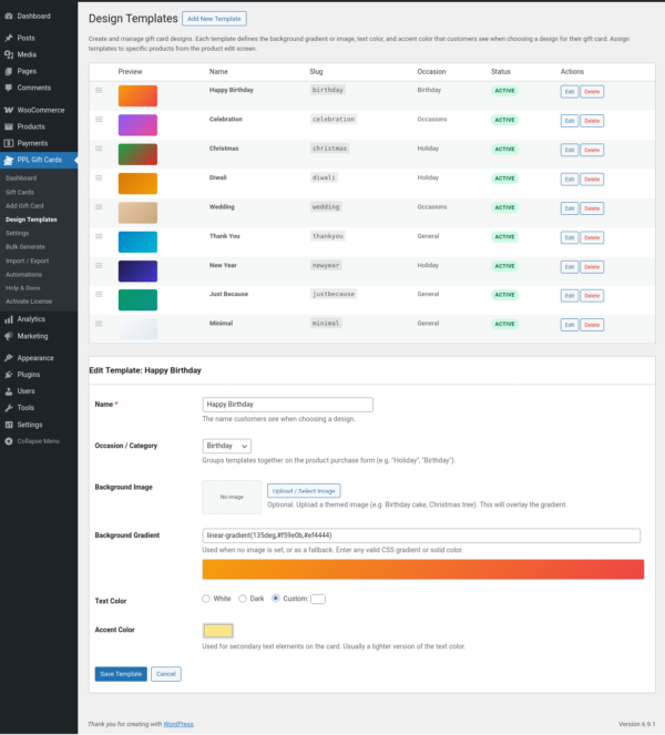 Gift Cards for WooCommerce is a complete gift card plugin with a live card designer, atomic balance security, bulk generation, scheduled email delivery, and a full REST API. Sell beautiful, personalised gift cards from your store – with no add-ons, no upsells, and no coding required. Compatible with WooCommerce HPOS and Block Checkout.