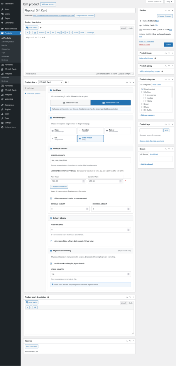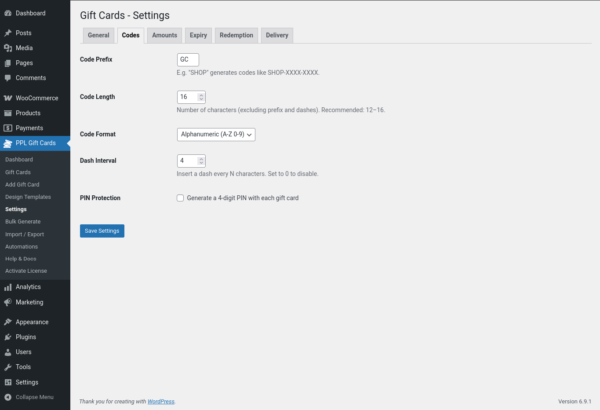 Gift Cards ships with a full REST API covering all CRUD operations, balance management, transfers, activity logs, and analytics reports. A comprehensive set of action hooks and filters lets you customise every part of the plugin’s behaviour without editing core files. The codebase is built with PHP 8, strict types, and follows WordPress and WooCommerce coding standards throughout.