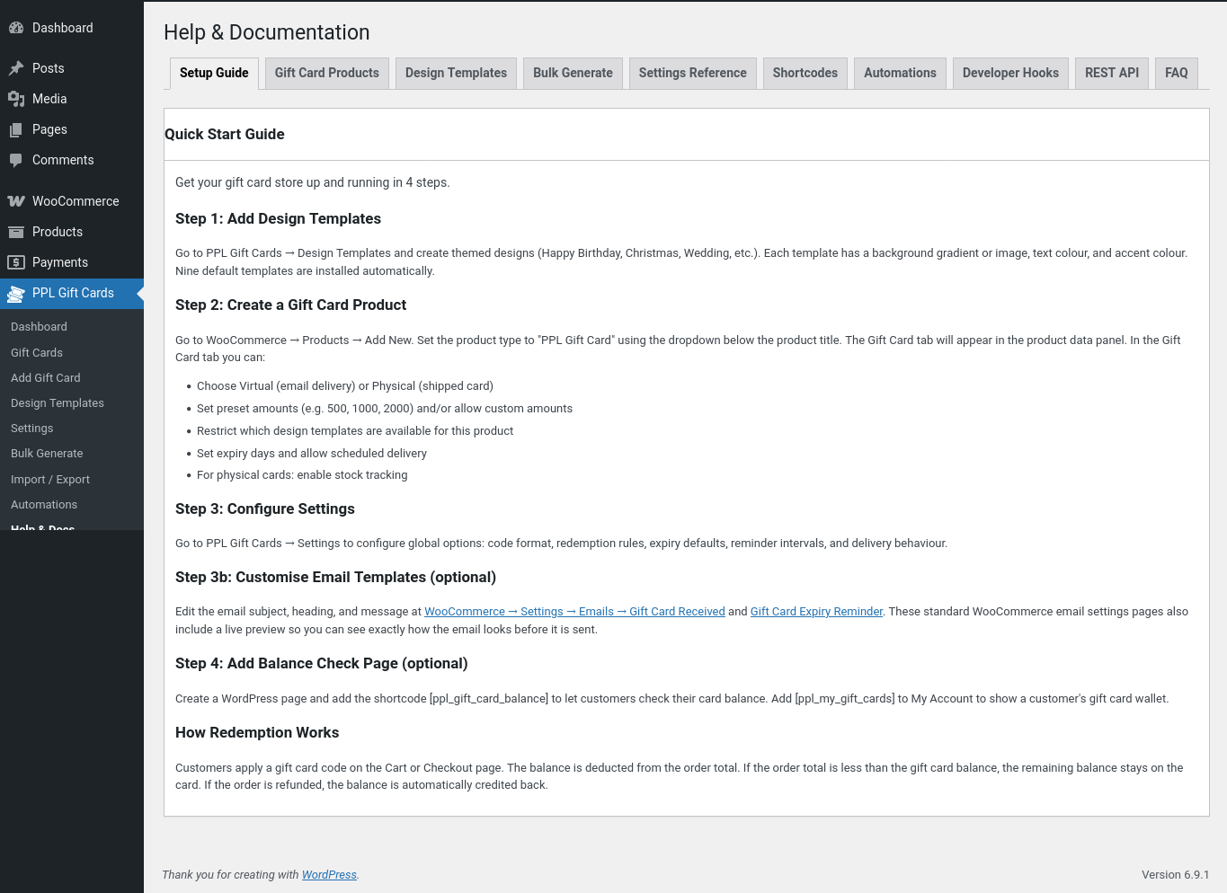 • [ppl_gc_redeem_form] – Lets customers apply a gift card code from any page on your site.