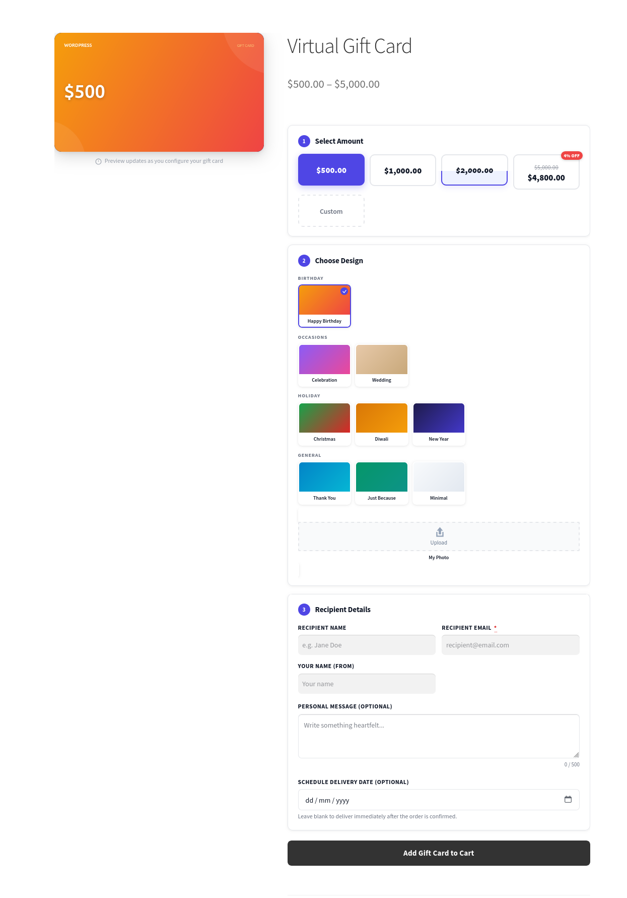 From the moment a customer lands on your product page to the moment they redeem their card at checkout, every step is smooth, beautiful, and automatic.